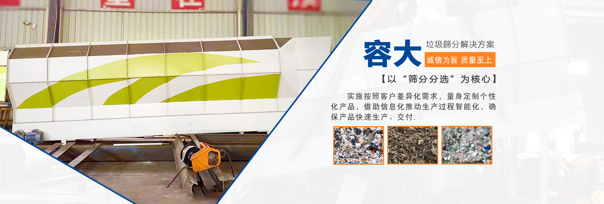 泉州容大機(jī)械有限公司是一家專研生活垃圾分選的企業(yè),以“篩分分選”為核心,實(shí)施按照客戶差異化需求,量身定制個(gè)性化產(chǎn)品,柔性化生產(chǎn)管理模式,以智能制造為主攻方向,以客戶需求為中心,借助信息化推動(dòng)生產(chǎn)過(guò)程智能化,確保產(chǎn)品快速生產(chǎn)、交付。生活垃圾處理領(lǐng)域內(nèi)的技術(shù)研究,利用篩分、分選技術(shù)的核心競(jìng)爭(zhēng)力,圍繞“智能、高效、節(jié)能、環(huán)?!卑藗€(gè)大字為中心,為循環(huán)經(jīng)濟(jì)項(xiàng)下的各種生活垃圾處理項(xiàng)目提供成套的技術(shù)解決方案 ...